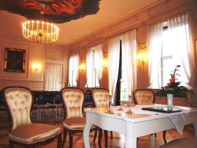 Möchten Sie im größeren Rahmen mit Freunden und Verwandten Ihr Glück besiegeln, steht Ihnen der Tugendsaal im Dietzelhaus für 25 - 50 Gästen oder der Weiße Saal im Landesbergamt für ca. 60 Personen zur Verfügung.
